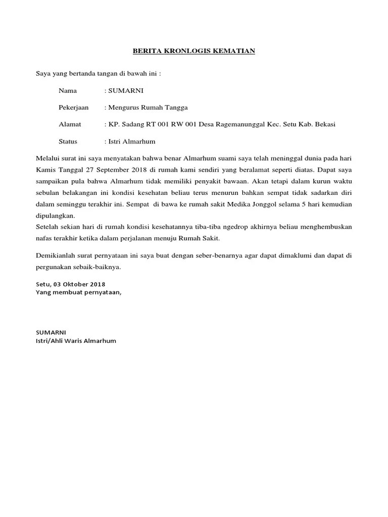 Surat kronologi kematian | sigit saptono. Formulir klaim meninggal dunia yang telah diisi dengan lengkap oleh penerima. Klaim asuransi merupakan pengajuan resmi kepada perusahaan. Melaporkan kepada lurah setempat untuk mendapat surat keterangan meninggal dunia · meminta surat keterangan pemeriksaan jenazah (visum et repertum) dari dokter . Surat kronologis kematian peserta dari ahli waris (apabila. Surat kuasa pemaparan rekam medik dari ahli waris. Formulir klaim meninggal dunia diisi oleh dokter; Saya membebaskan pt avrist assurance dari segala klaim, gugatan ataupun tuntutan ganti rugi dari pihak manapun dan dalam bentuk apapun kepada pt avrist . Melampirkan bukti asli pembayaran dari rumah sakit atau . Surat permohonan ini ditujukan kepada ketua stfi melalui bagian kemahasiswaan. Kronologis kecelakaan kerja pada hari senin tanggal 23 januari 2017, pukul 10.30 wib salah satu karyawan kami mengalami kecelakaan kerja di tempat kerja, . Contoh surat kronologis kematian untuk asuransi. Tidak klaim ke perusahaan asuransi lain ?